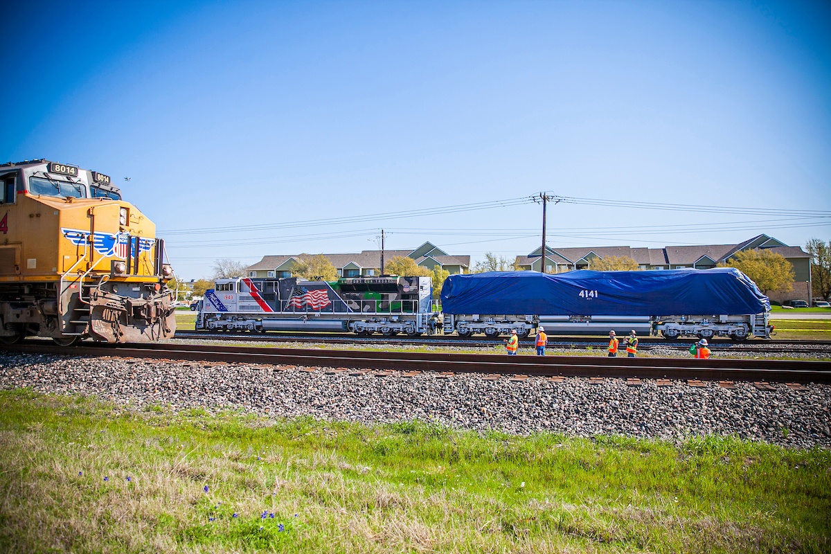 1 March 22, 2021 A blanketed No. 4141 pulled into College Station on Sunday morning behind UP locomotive No. 1943. ← Previous Image Next Image →
